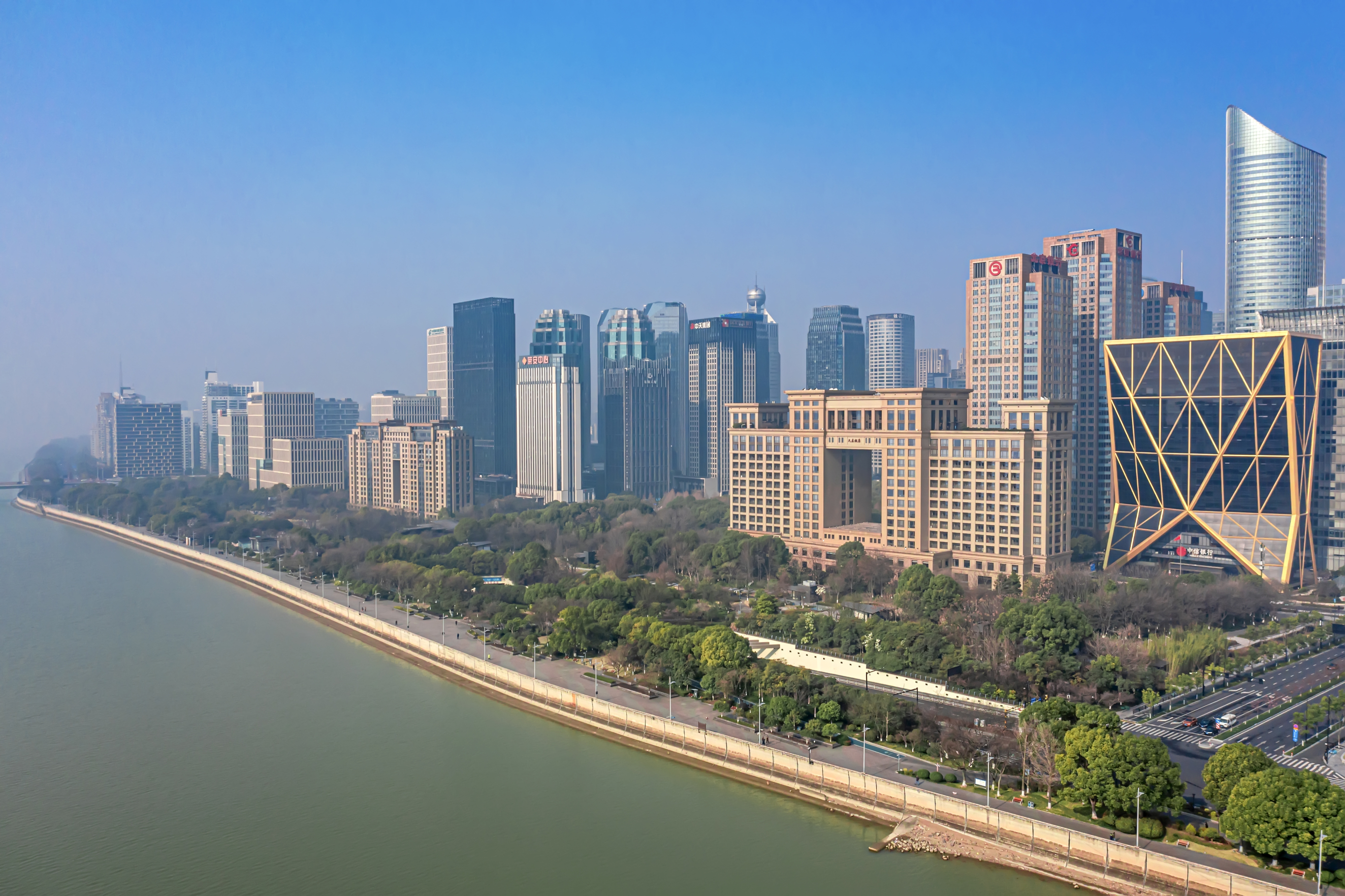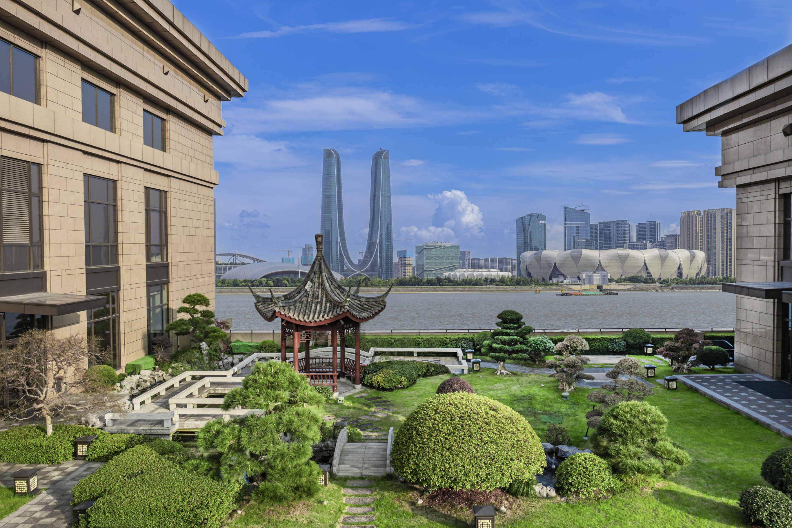 钓鱼台酒店的建筑设计由英国ATKINS事务所操办,外形庄重沉稳,但楼中又“镂空”,犹如一扇面向钱塘江的大门。如此精妙的设计,沉稳中透着灵气,又为后排的高层建筑提供了通透的江景视野。