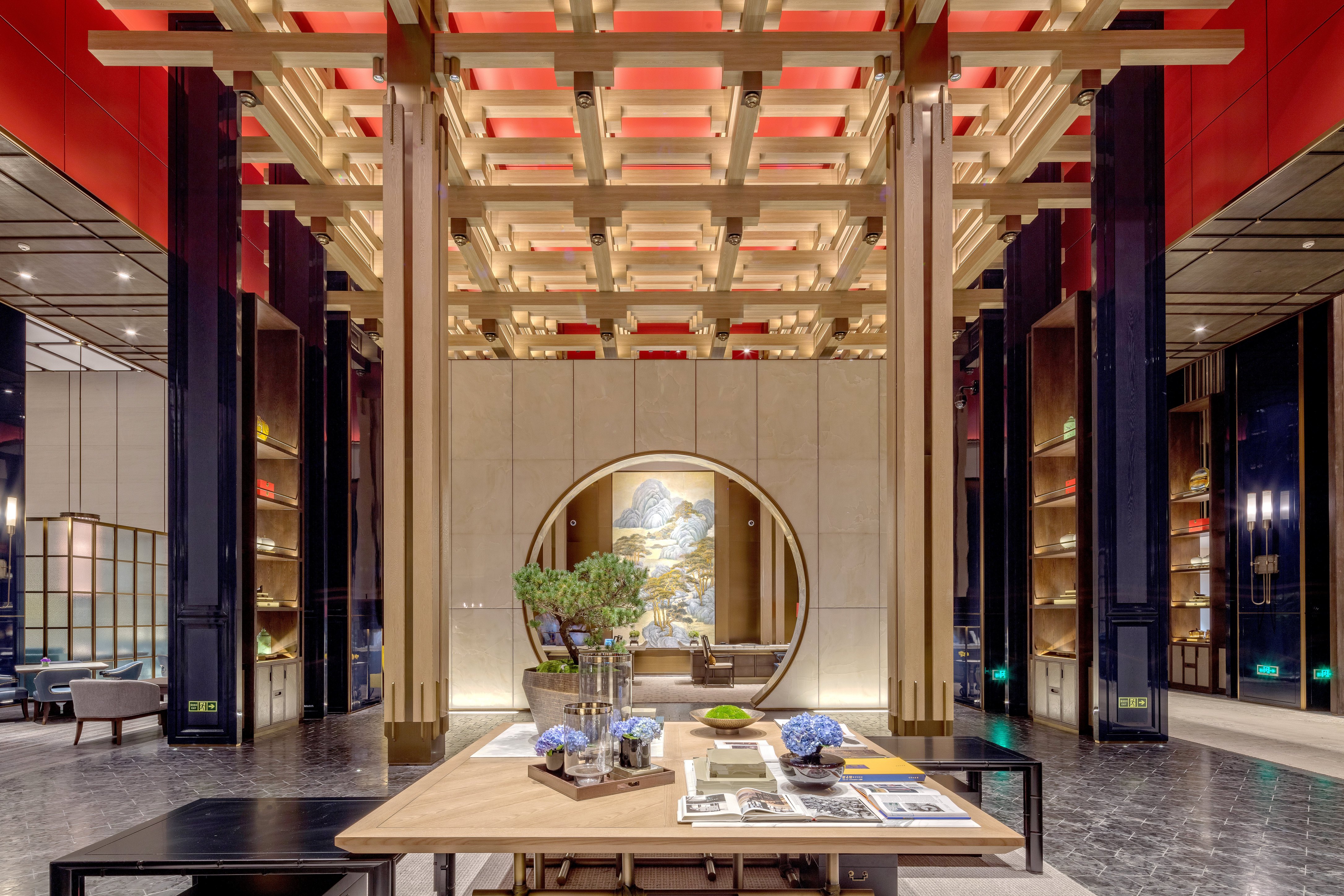 大堂是客人进入酒店的第一进空间,宽敞大气,顶上是暗金色的柱椽形象。杭州泛海钓鱼台酒店大堂两侧的“厢房”分别有两道圆形的月门,巧妙的分为前台和休息区,前台后背景墙通高的漆画,题材选自南宋时期钱塘画家刘松年笔下的青绿山水。隔而不断的木架置放着书籍与珍玩,体现出酒店的学识品味和高雅气质。